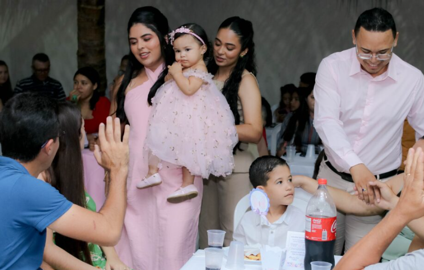 Edelson e Mônica recepcionaram os convidados no FJ Espaço, em Padre Marcos. Entre os presentes estavam os padrinhos de Maria Ísis, primos, tios, avós, bisavós e demais familiares.