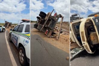 Um caminhão tombou na manhã desta quarta-feira (24) depois que o motorista perdeu o controle…