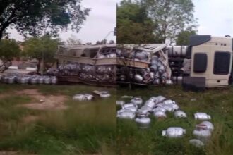 Um caminhão carregado de botijões de gás tombou na manhã desta quinta-feira (31) na rotatória…