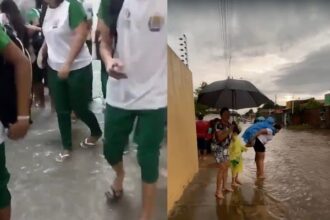 Uma escola alagou e alguns alunos chegaram ao local carregados pelas mães, para que não…