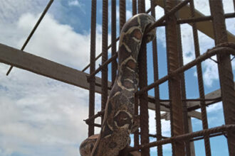 Uma cobra jiboia foi encontrada na tarde de terça-feira (26) pendurada na haste de ferro…