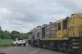 Um carro foi empurrado por um trem de carga ao passar pela linha férrea na…