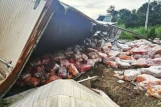 Na tarde desta segunda-feira (07/04), um caminhão baú transportando arroz e flocos de milho tombou…