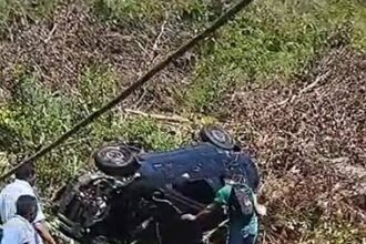 Um veículo de passeio capotou e caiu em um bueiro no início da tarde desta…