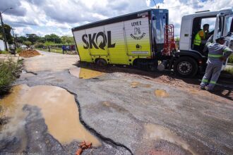 Um caminhão de uma cervejaria acabou ficando atolado ao tentar desviar dos buracos localizado na…